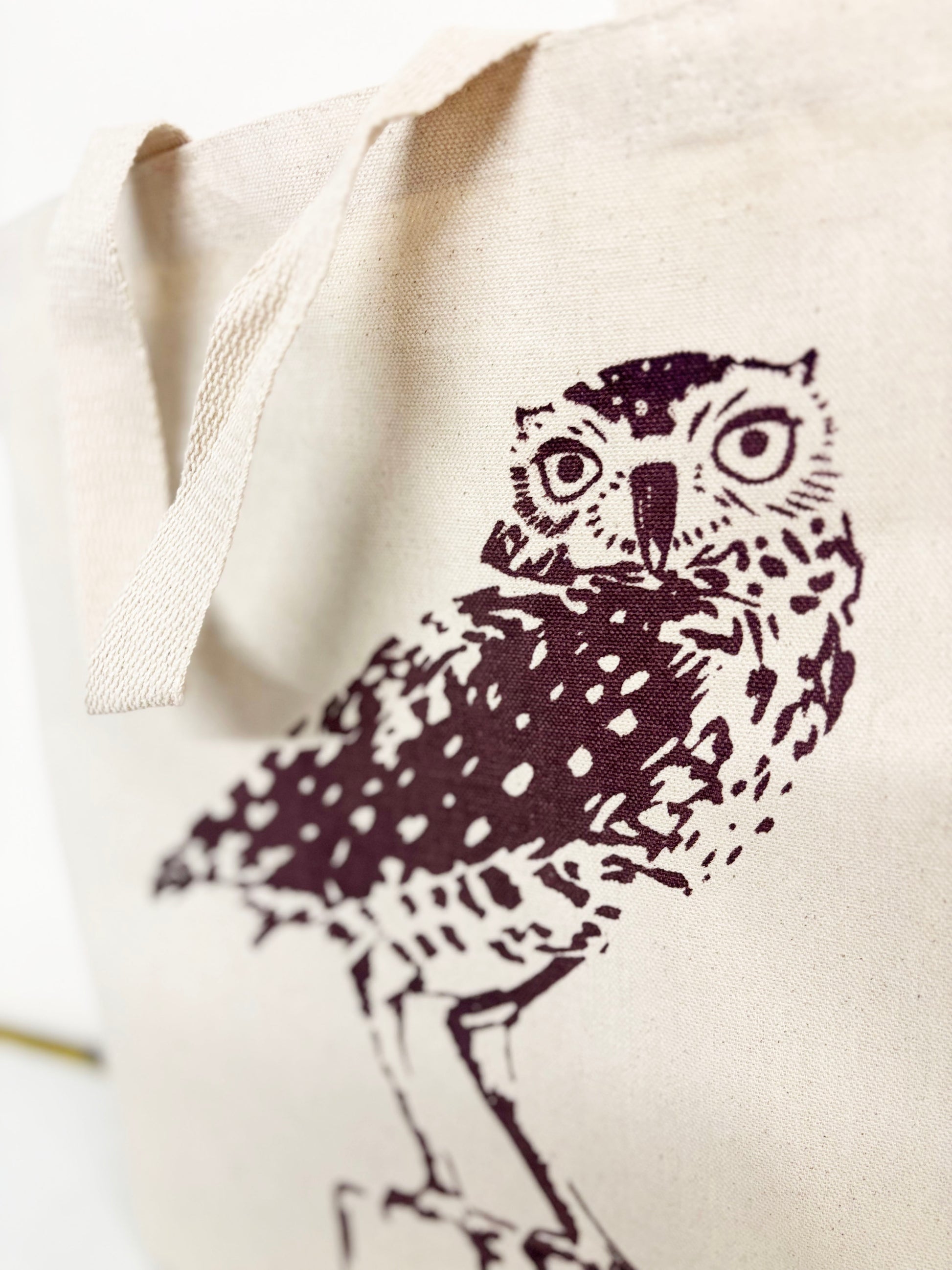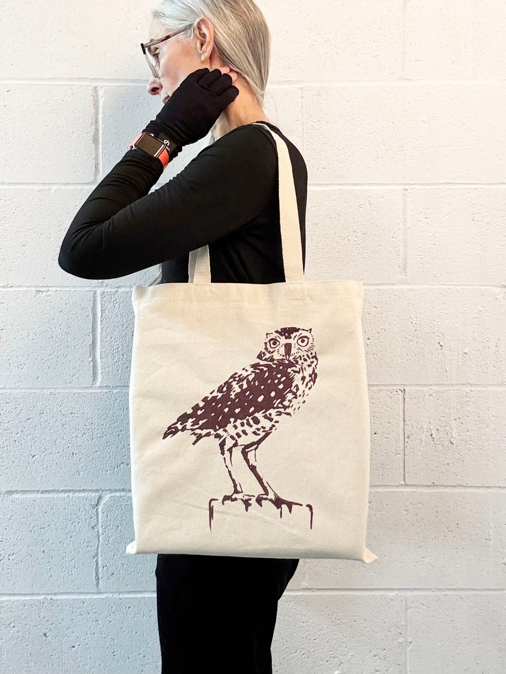 A hand printed Burrowing Owl tote is utilitarian yet beautiful!
